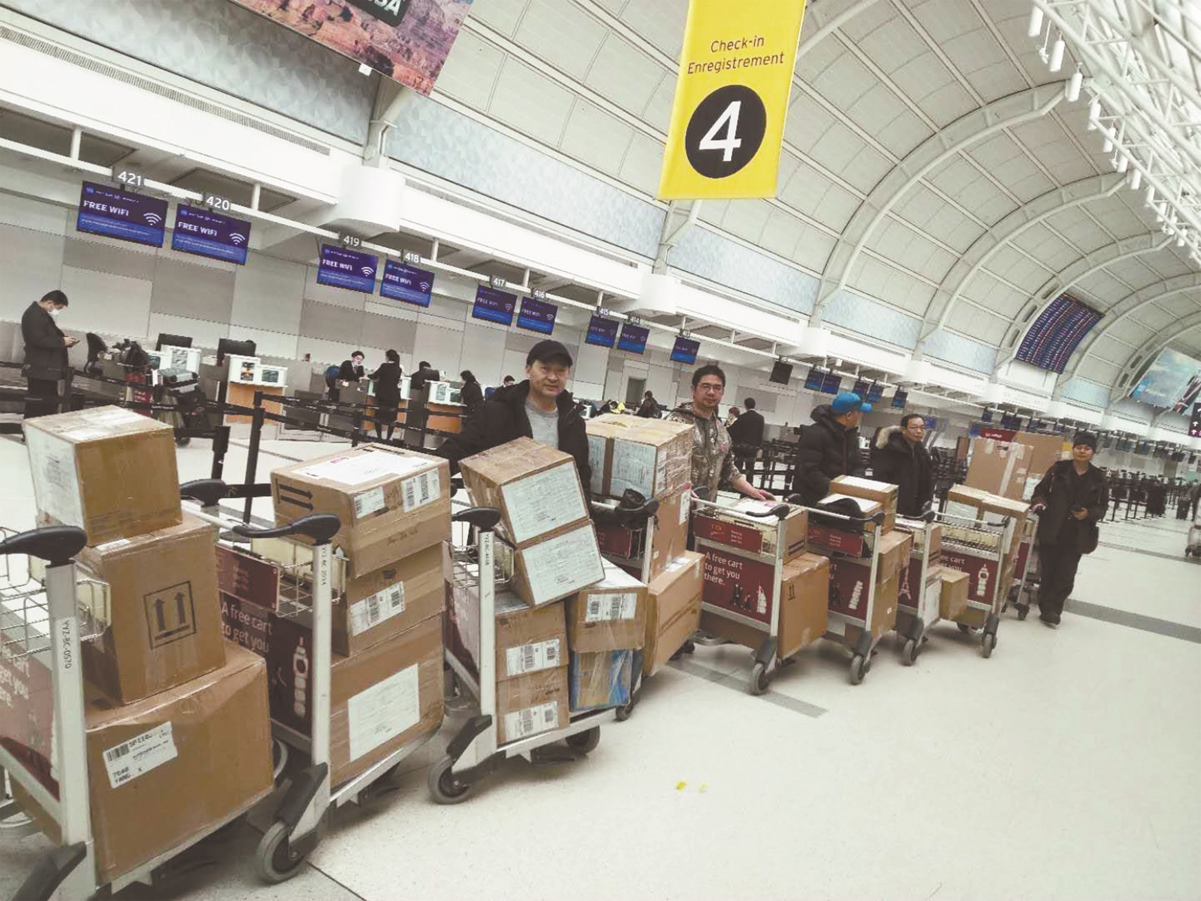 2月29日,捐赠者在加拿大机场护送捐赠物资,该批物资于3月初抵达受赠医院。 (胡健铭 供图)