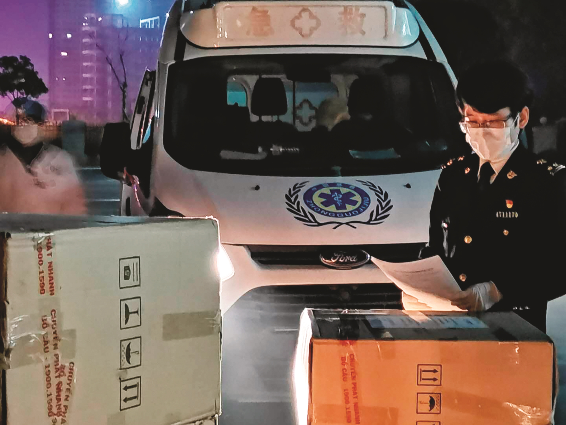 海关人员深夜查验,保障境外捐赠物资快速通关。 (何霜英 供图)