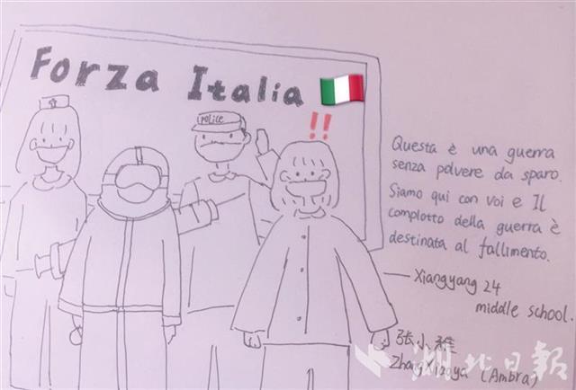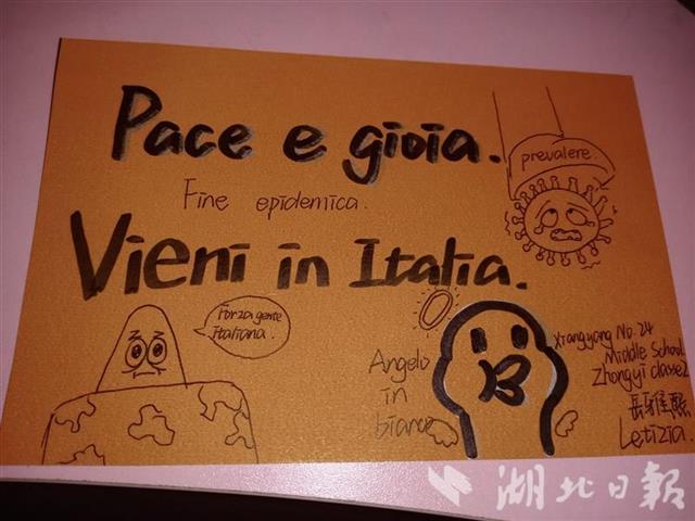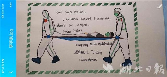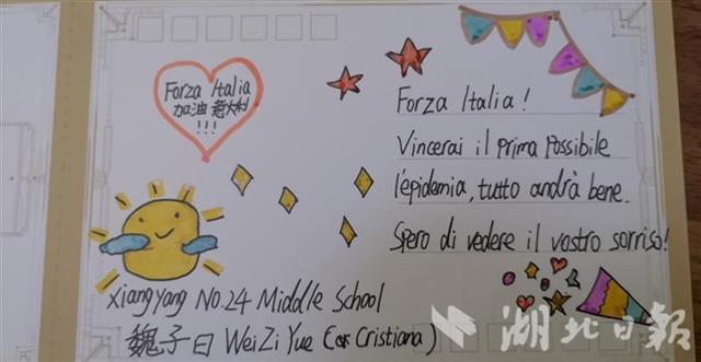随同这批援助物资一同寄往意大利的,还有襄阳市第二十四中学“中意文化合作班”近120名学生绘制的各种祝福卡片,在卡片上许多同学不约而同写道“Forza China!Forza Italia!”(中国加油!意大利加油!),字里行间饱含着青年学子们对意大利人民的真挚祝福。