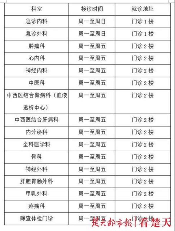 楚天都市报讯(记者陈凌燕 通讯员贝兰)3月26日获悉,湖北省第三人民医院(湖北省中山医院)继3月18日起恢复部分门诊和病区后,3月30日(下周一)起,将恢复部分普通病区。具体如下: