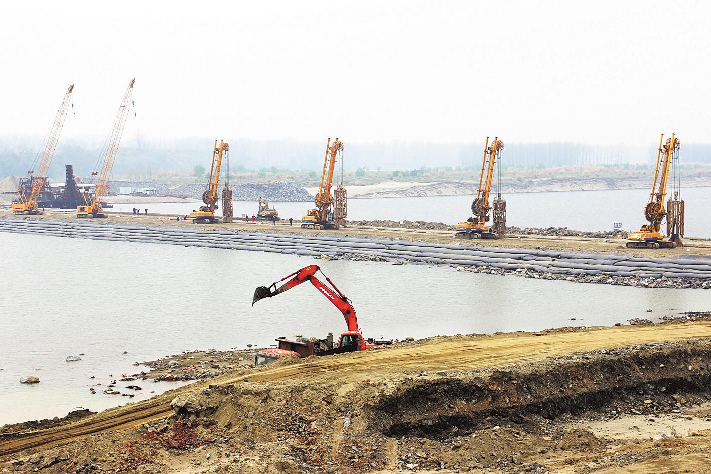 3月24日,在宜城市汉江雅口工地,24台自卸车、5台挖机有序配合,正在进行二期围堰防护施工,迎来复工复产后首个施工高峰期。 (视界网 王建锋 摄)