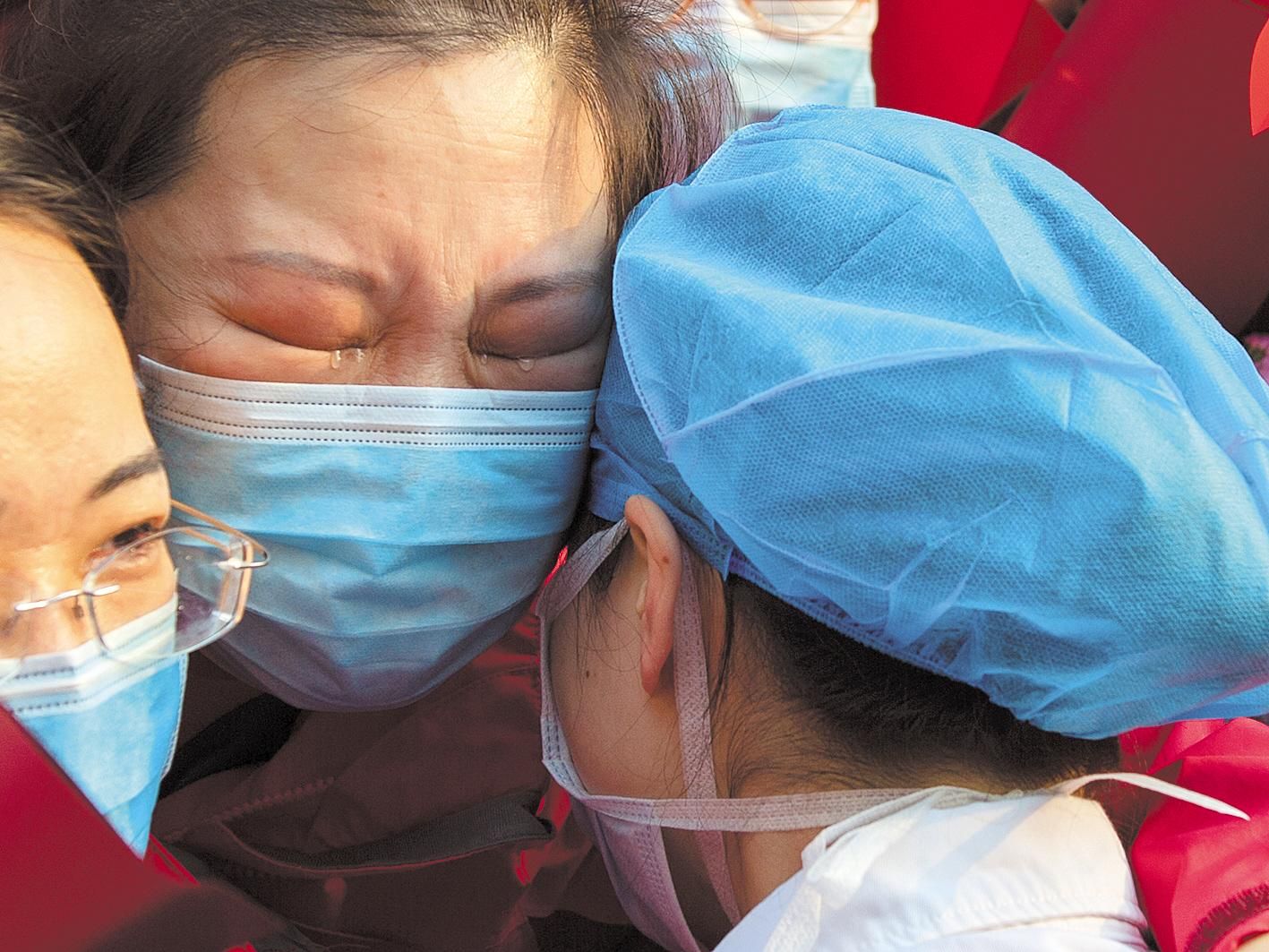 3月26日,武汉市硚口区梅园宾馆,河南援鄂医护人员在送别仪式上落泪。据了解,河南省第一批援鄂医疗队对口支援武汉市第四医院,经过两个月奋战,共有200多名新冠肺炎患者在他们的救治下康复出院。 (湖北日报全媒记者 蔡俊 通讯员 赵军 吴佳 摄)