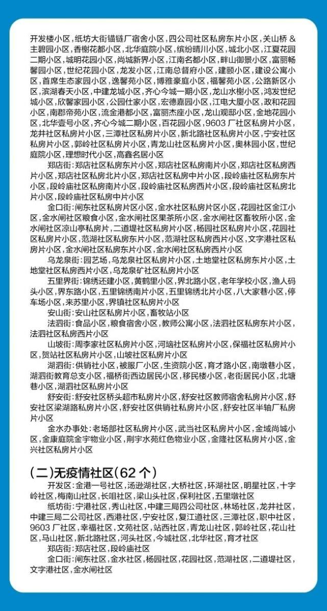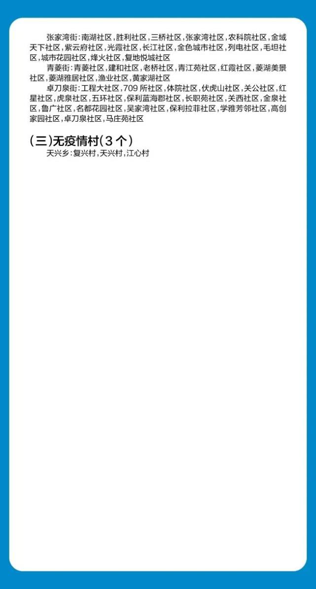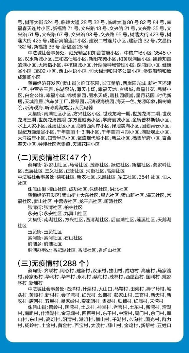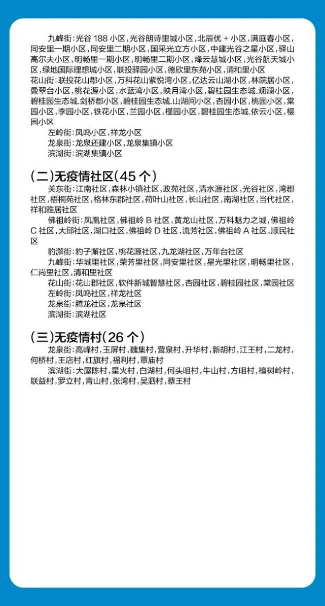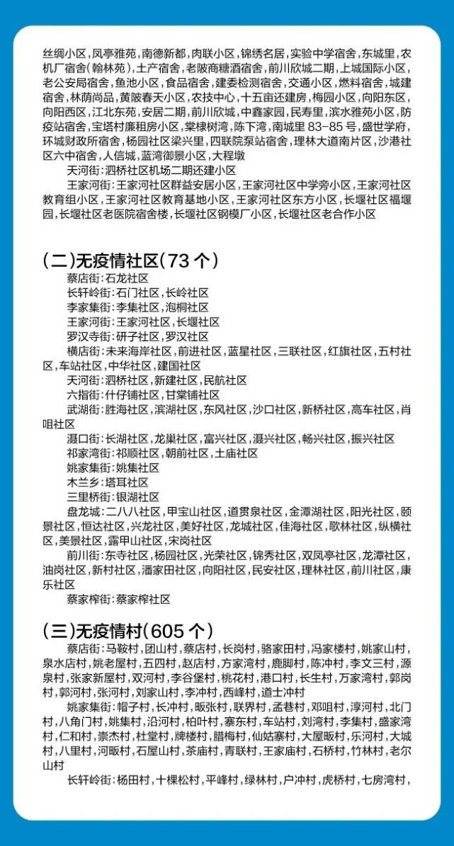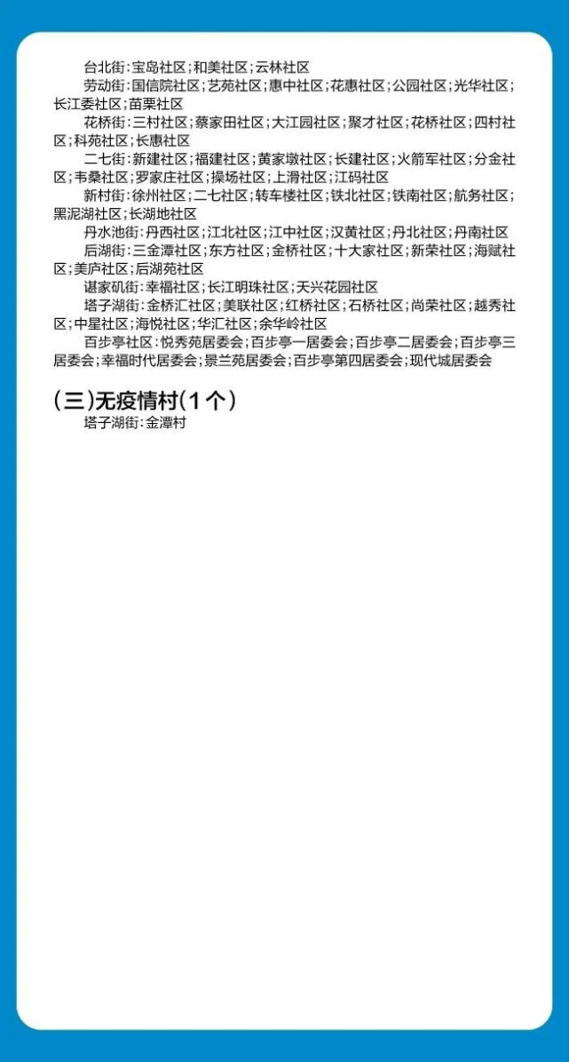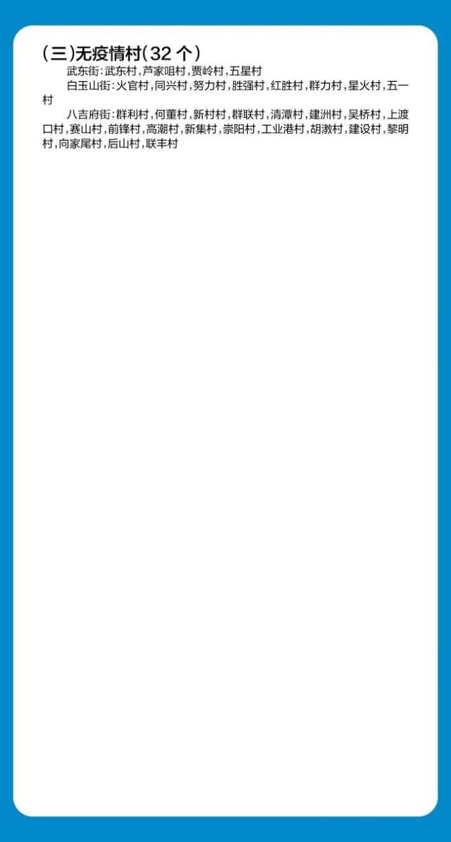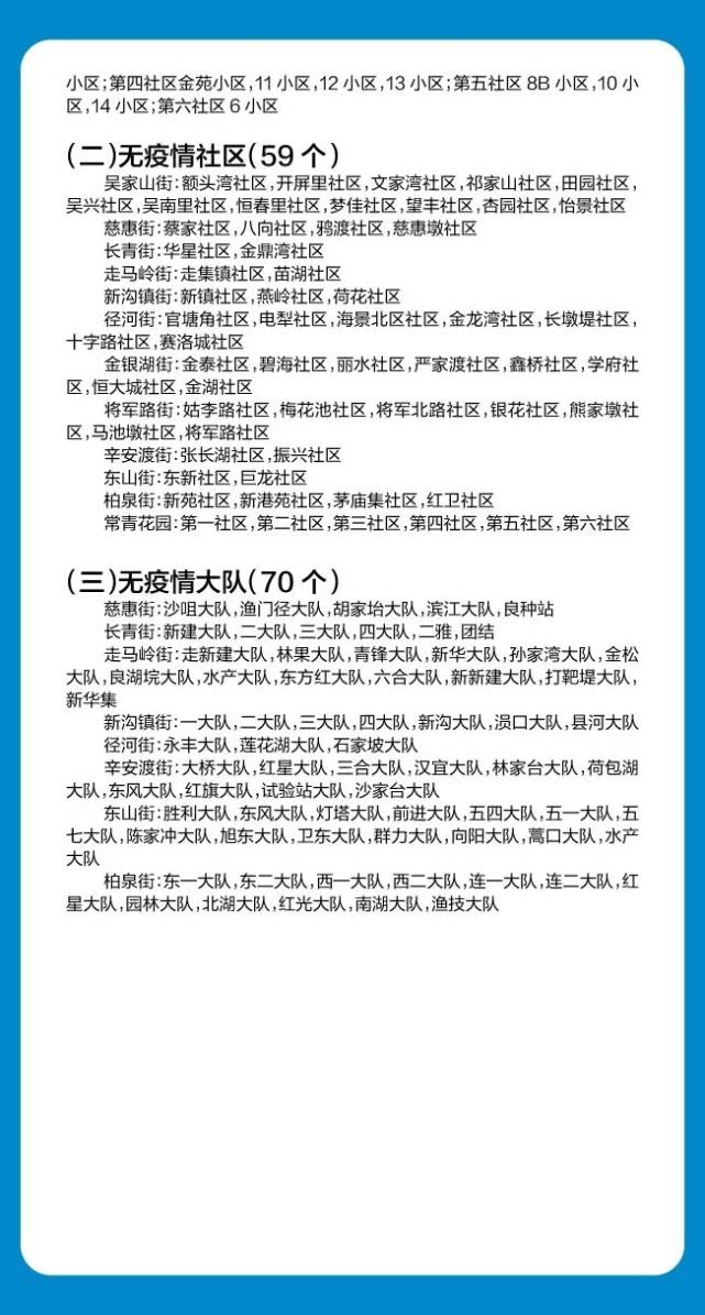 经各区第八次评定,全市无疫情小区新增179个,无疫情社区新增166个,无疫情村(大队)新增8个。同时因疫情变化核查处理,无疫情小区取消或暂停9个,无疫情社区取消或暂停4个,无疫情村(大队)取消或暂停0个。