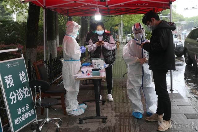 3月27日,武汉大学中南医院开始恢复普通门诊,接待普通患者诊疗。本月20日开始,该院首先开通普通急诊,27日开始,每天通过网上预约挂号300名普通患者,日后逐步恢复正常。图为医院外的预检分诊处,导医在查看患者预约挂号信息。(湖北日报全媒记者 周立新 梅涛 摄)