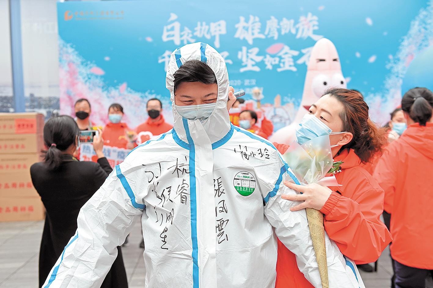 3月27日,在驻地武汉保利大酒店举行的欢送仪式上,内蒙古医疗队队员为一名身穿防护服的志愿者签下名字。 (湖北日报全媒记者 李溪 摄)