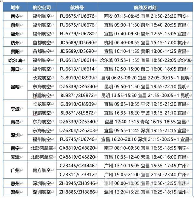 湖北日报讯(记者雷巍巍、通讯员王婷婷)根据中国民航局《关于恢复湖北省民航航班的通知》,自3月29日零时起,恢复湖北省除武汉天河机场外其他机场的国内客运航班。当天,宜昌三峡机场恢复宜昌至福州、深圳、西安、泉州、杭州、贵阳、哈尔滨、海口、昆明、宁波、青岛、天津、南宁、广州、惠州、温州方向航班(详见图片信息)。