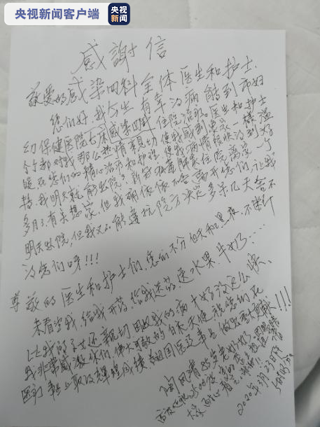 3月24日,湖北省妇幼保健院光谷院区一位85岁的老奶奶在军队支援湖北医疗队的精心救治下顺利出院。出院前一天,她到护士站要了纸和笔,虽然近视2500度,但她依然坚持要写信表达自己的感激之情。