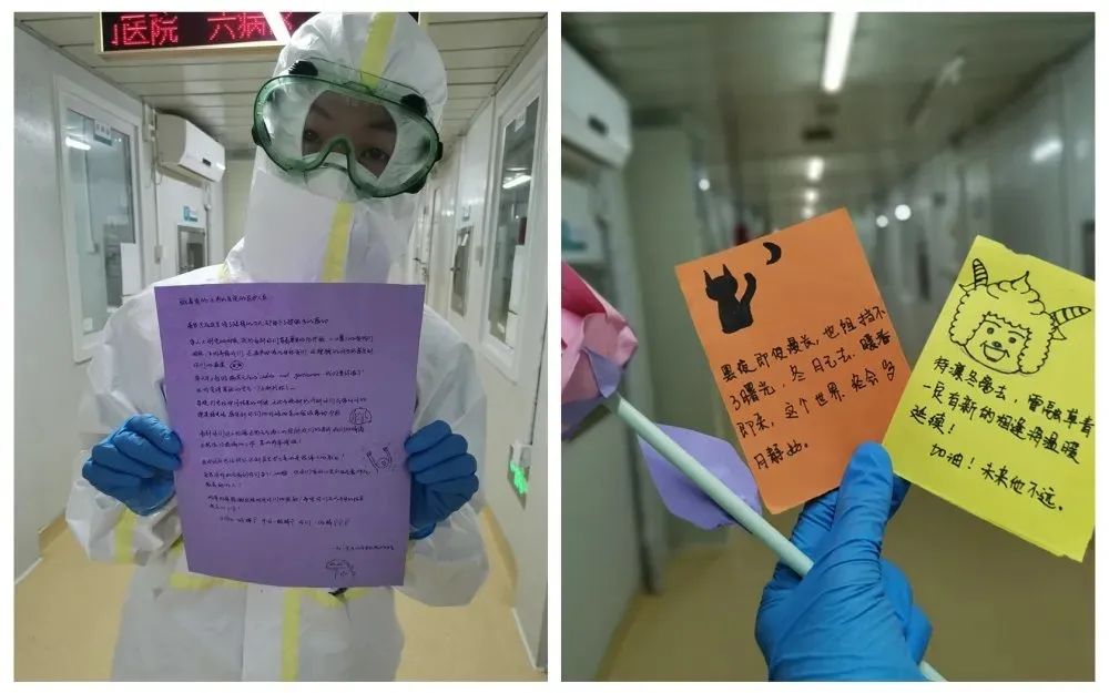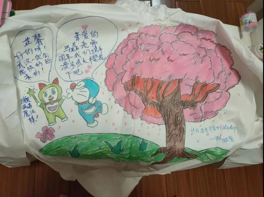收到武汉协和西院护士画的画,上面有两个机器猫,画着我和她那天上班时的对话,她说:“马老师,等疫情结束了,我要带你去看黄鹤楼,去武大看樱花,去吃海底捞,去喝好多杯奶茶。”她工作刚刚三年,才25岁,她还不知道什么是危险的时候,就进了隔离病区,和我开始上第一个夜班,我问她:“你害怕吗?”她说:“马老师,我不害怕,可是我周围也有很多感染的朋友,我却无能为力,我害怕这些。”她们真的为了救治危重患者,不能回家,也顾不上家里人,因为前期太缺护士了。一直到医疗队陆续到来,她们才有机会轮休。