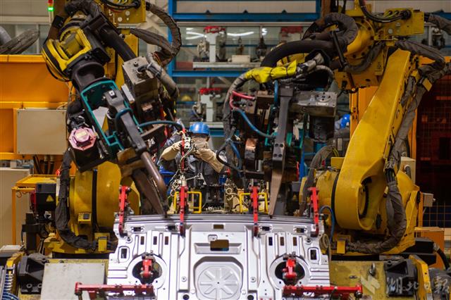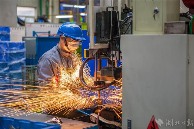 3月28日,武汉长华长源汽车零部件有限公司生产车间,工作人员正在对汽车零部件进行焊接。