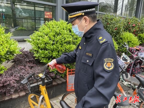 4号线钟家村站,城管队员给共享单车扶手消毒 通讯员周玉琴 供图