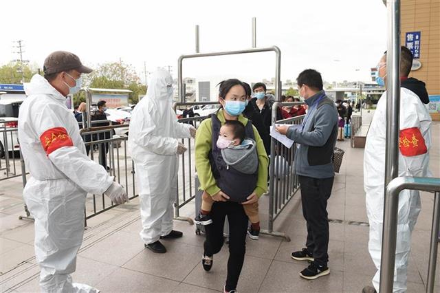 3月28日下午,251名滞留武汉的省内群众在武汉市新荣客运站集结,陆续乘坐大巴回乡。负责集中转运工作的湖北公路客运集团(省客集团)董事长梁智介绍,这251人分别来自鄂州、黄石、咸宁、潜江等地市,因各种原因滞留武汉。当日,各地方政府派遣车辆进入武汉,在新荣客运站将他们陆续接回家,所有回乡者核酸检测结果呈阴性。图为滞汉人员经身份验证后进站乘车。(湖北日报全媒记者 李溪 摄)