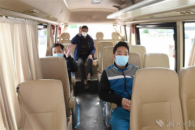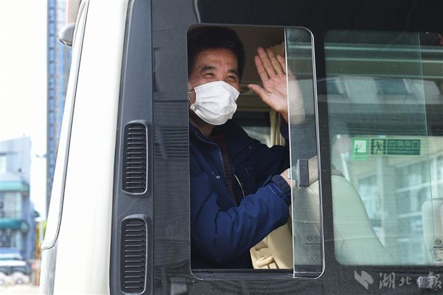 图为前往潜江的车辆驶出新荣客运站,滞汉人员挥手向工作人员告别。