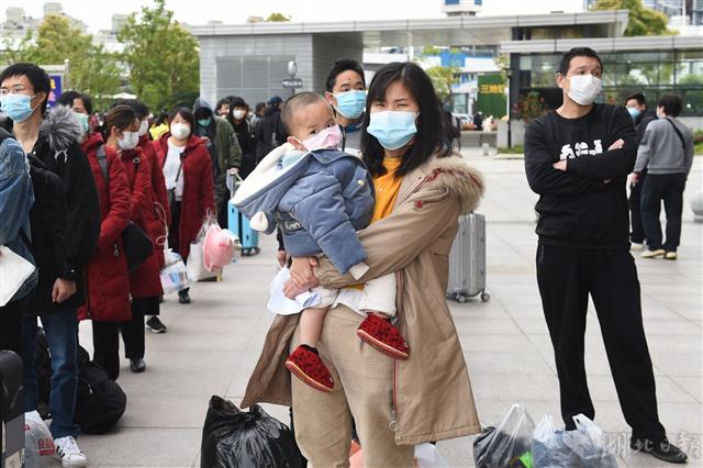 图为滞汉人员排队等候进站乘车。