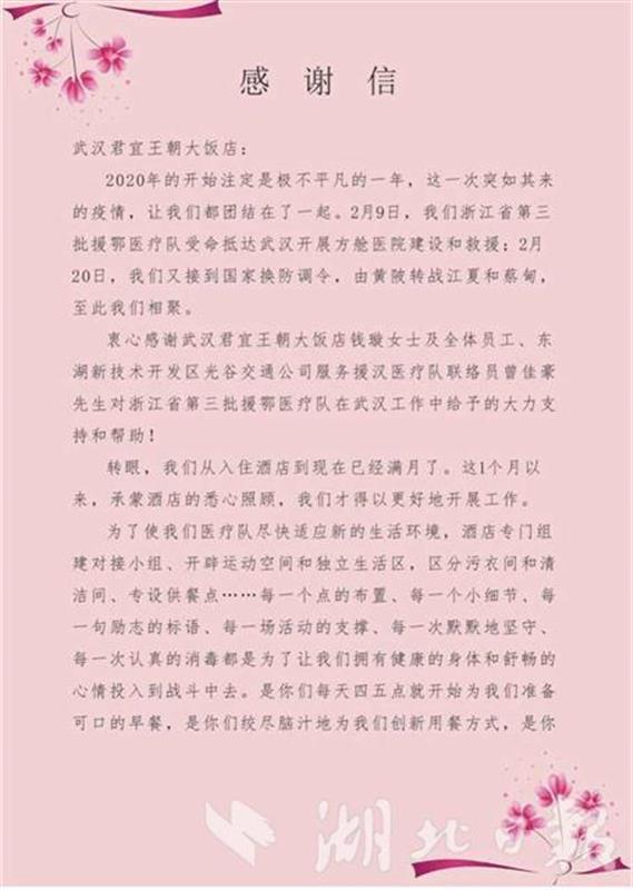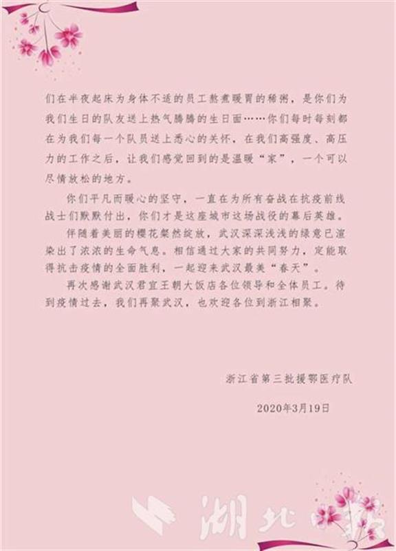 湖北日报讯(记者胡雯洁)“武汉的樱花开了,西湖边的桃花也已绽放。待疫情结束,我们再聚武汉,也欢迎各位来浙江。”3月28日,浙江省第三批援鄂医疗队返程。临行前,他们送出了三封写给武汉驻地酒店的感谢信。