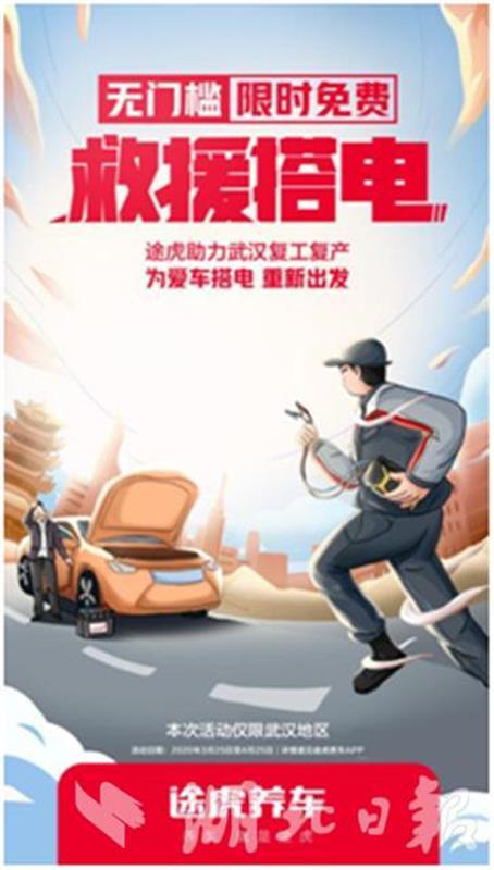 湖北日报讯(记者吴文娟、通讯员胡翠兰)为保障武汉车主复工后顺利出行,在湖北省消委指导下,途虎养车3月28日宣布,为武汉地区车主提供免费搭电服务。