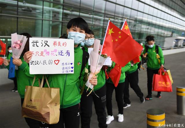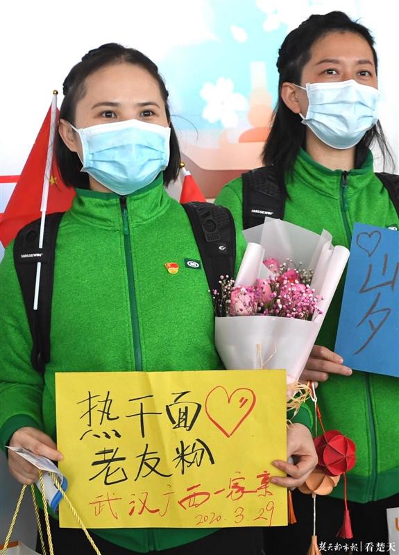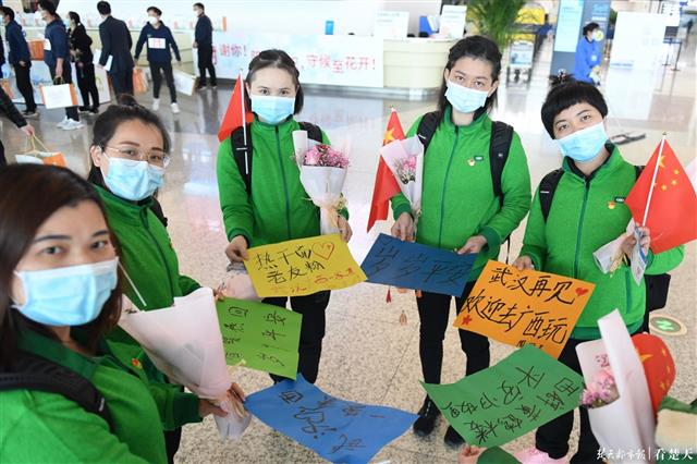 楚天都市报3月29日讯(记者刘孝斌 黄士峰)“西辞黄鹤楼,平安归故里”、“武汉再见,欢迎去广西玩”……今日中午,广西第四批援鄂医疗队队员,手持写满祝福语的纸张,跟武汉人民告别。
