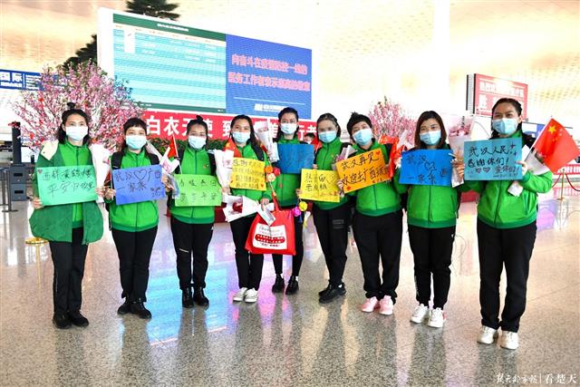 在武汉天河机场,广西第四批援鄂医疗队队员9名手持祝福语的队员,格外醒目。