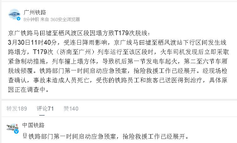 3月30日11时40分,受连日降雨影响,京广线马田墟至栖凤渡站下行区间发生线路塌方,T179次(济南至广州)列车运行至该区段时,火车司机发现后立即采取紧急制动措施,列车撞上塌方体,导致机后第一节发电车起火,第二至六节车厢脱线倾覆。铁路部门第一时间启动应急预案,抢险救援工作已经展开。经现场检查确认,事故未造成人员死亡,受伤的铁路员工和旅客已送医得到治疗,具体原因正在调查中。
