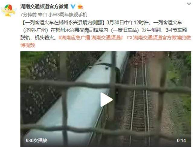 3月30日中午12时许,一列客运火车(济南-广州)在郴州永兴县境内(一废旧车站)发生侧翻,3-4节车厢脱轨,机头着火。