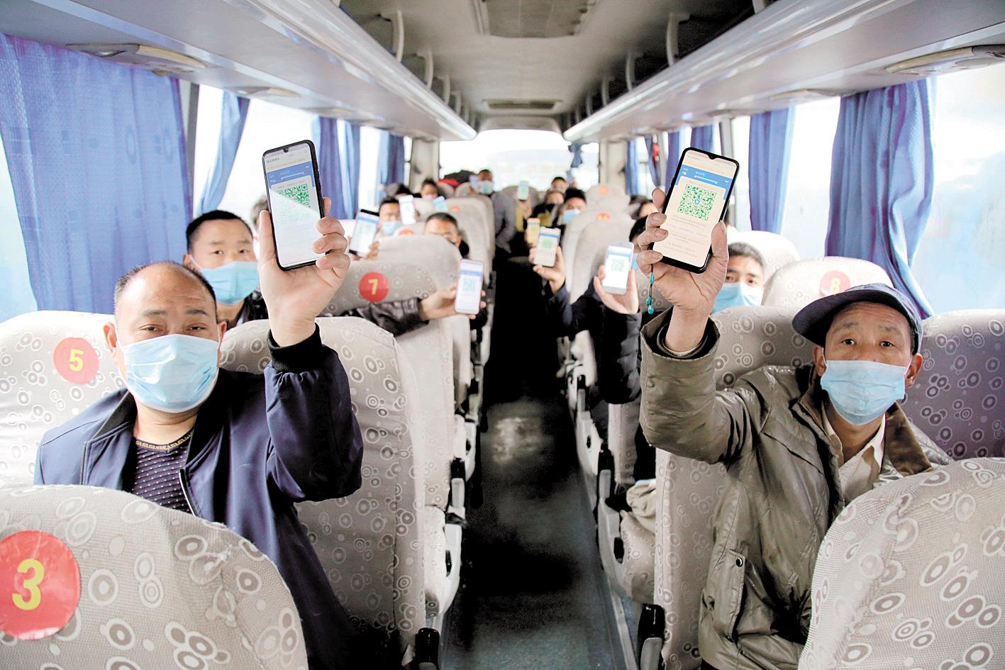 3月27日,在十堰市郧阳区客运站,赴广东省深圳市返岗复工人员展示手机上的“湖北健康码绿码”。连日来,郧阳区组织各乡镇务工人员分批次乘坐“点对点、一站式”专车,赴省外返岗复工。该区目前已向“绿码互认”城市杭州、深圳、广州等地输送务工人员5批次929人。在“绿码互认”地区,湖北人凭湖北健康码绿码,不需要另行隔离,就能顺利上岗复工。 (视界网 曹忠宏 摄)