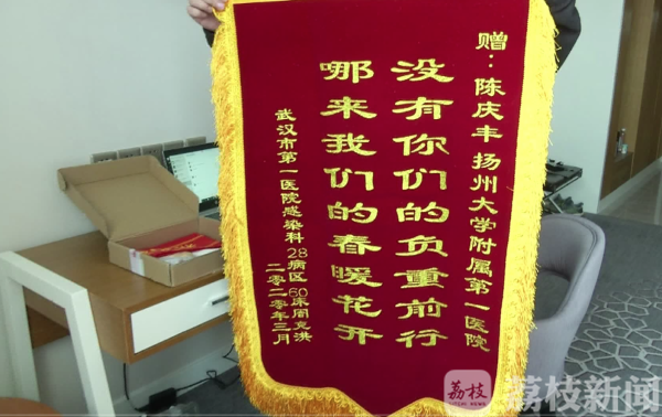 原来,这面锦旗是患者周阿姨寄来的。今年65岁的武汉人周阿姨,2月15日住院治疗时,不仅双肺严重感染,还出现了严重的心理焦虑。经过陈医生等扬州医护人员的精心治疗,周阿姨终于治愈出院,目前已经结束隔离,回到了自己家中。