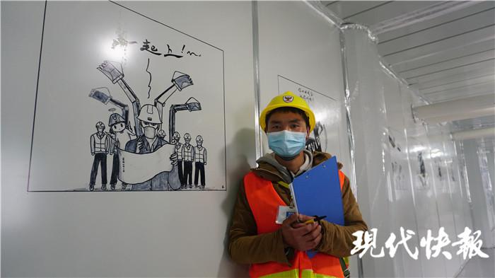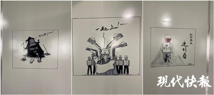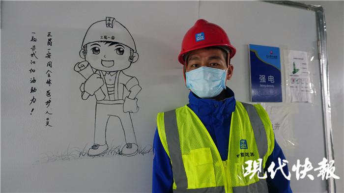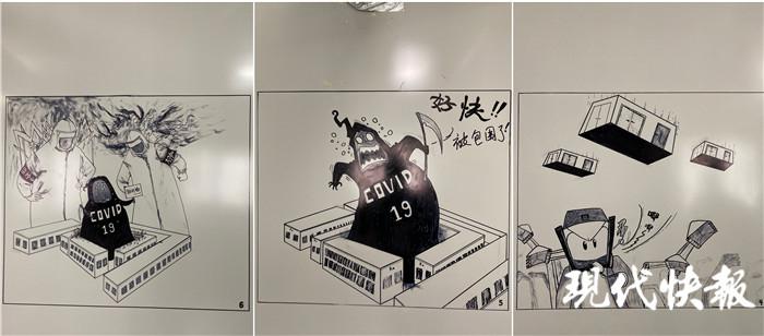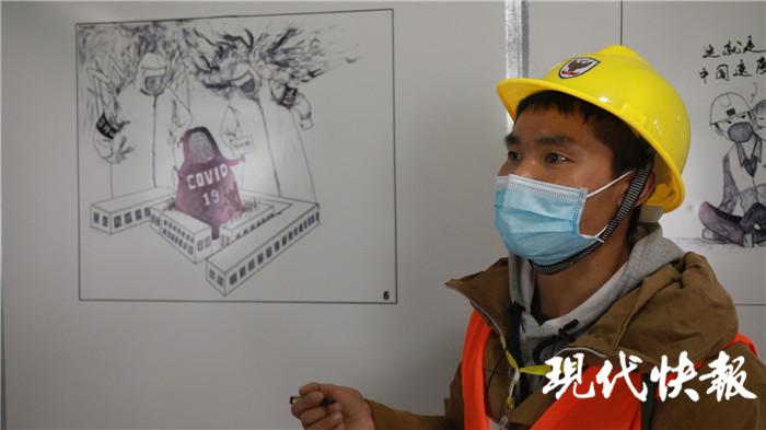 许新焰看到医护人员通道的一面墙空着,就用一组漫画,把中建三局建设医院对抗 " 疫魔 " 的过程,用 9 幅漫画体现出来。" 就是想给医护人员、志愿者和我们这些维保队员力量,我们用几天时间就把医院建起来了,这样的速度,不怕疫魔。" 他说,每幅漫画大约需要耗费一两个小时,有时画着画着就要出工,前前后后花了七八天的时间,才把整组漫画全部画完。