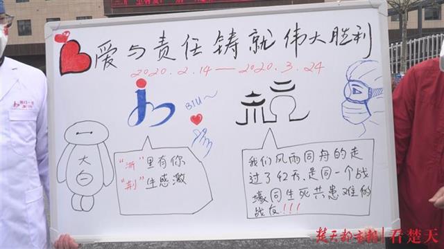 记者注意到,白板最上面写着“爱与责任铸就伟大胜利”,这是建舱后大家一直坚守的信念。中间写着一串数字2020.2.14——2020.3.24,分别是新冠ICU开科的时间和休舱的时间。下面画着荆门一医的标志和杭州的标志,中间是比心代表着荆门一医和杭州的朋友们永远在一起。