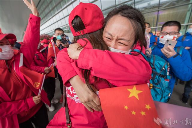 3月31日,准备返回的上海市援鄂医疗队第一批和第四批的队员,在武汉天河机场“会师”。上海市援鄂医疗队第一批和第四批队员,分别进驻金银潭医院和雷神山医院重症病区,许多队员都是一个单位的同事,虽然同在武汉,但60多天未曾见面,在踏上归途时重逢,大家相互拥抱、喜极而泣。(湖北日报全媒记者 魏铼 摄)