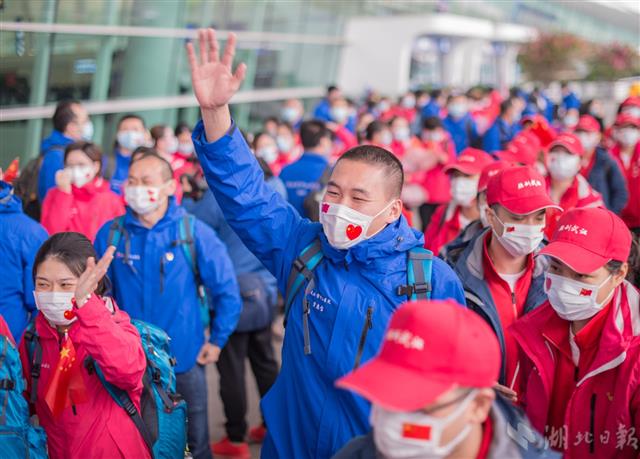 3月31日,准备返回的上海市援鄂医疗队第一批和第四批的队员,在武汉天河机场“会师”。