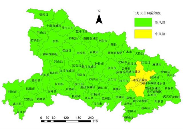 依据国务院应对新型冠状病毒感染肺炎疫情联防联控机制《关于科学防治精准施策分区分级做好新冠肺炎疫情防控工作的指导意见》中的风险划定标准,经省疾控中心组织专家评估,截至3月30日24时,全省低风险市县75个,中风险市县1个(武汉城区),无高风险市县。武汉市13个城区中,低风险区8个,中风险区5个,其中,与3月28日相比,武汉市汉阳区降为低风险,其他区无变化。