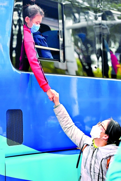 3月31日,在沌口明德酒店,北京医疗队队员与前来送行的武汉战友紧紧牵手,不舍离别