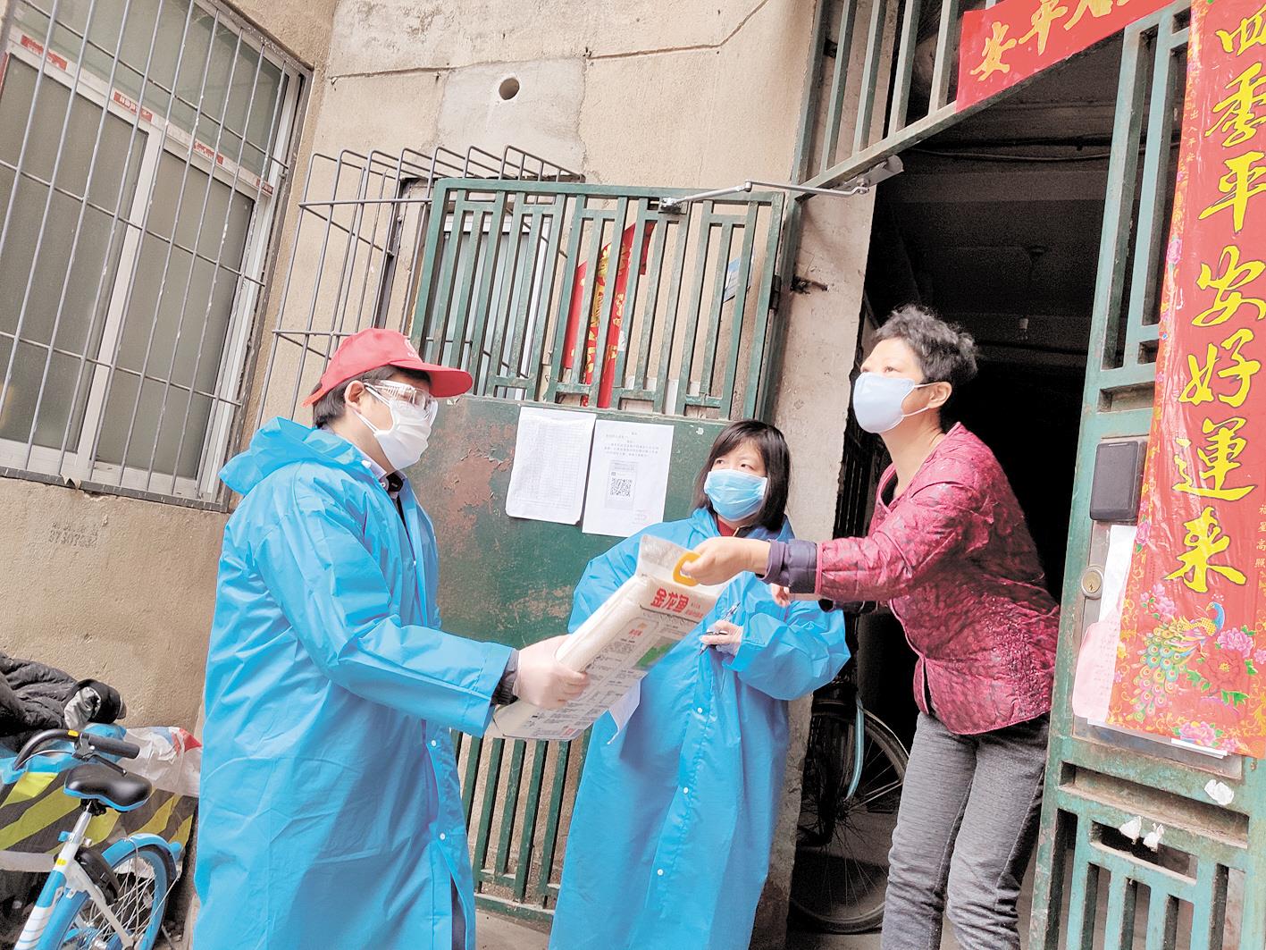 志愿者为居民送米。