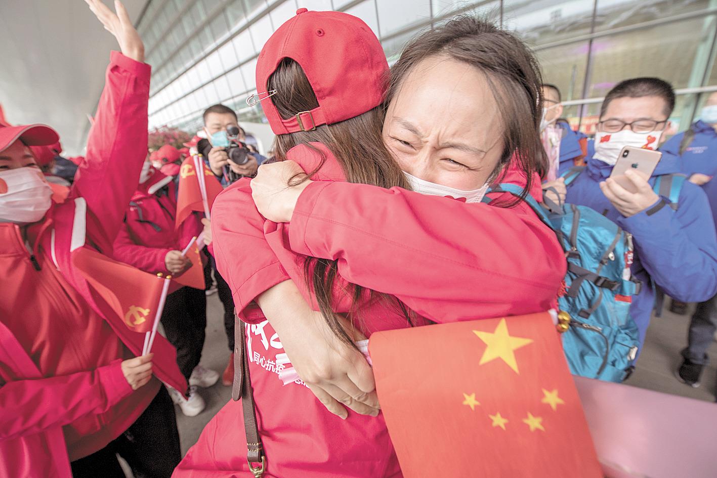 3月31日,准备返沪的上海市援鄂医疗队第一批和第四批的队员,在武汉天河机场“会师”。上海市援鄂医疗队第一批和第四批队员,分别进驻金银潭医院和雷神山医院重症病区,许多队员都是一个单位的同事,虽然同在武汉,但60多天未曾见面,在踏上归途时重逢。