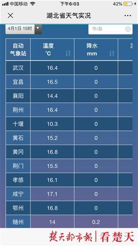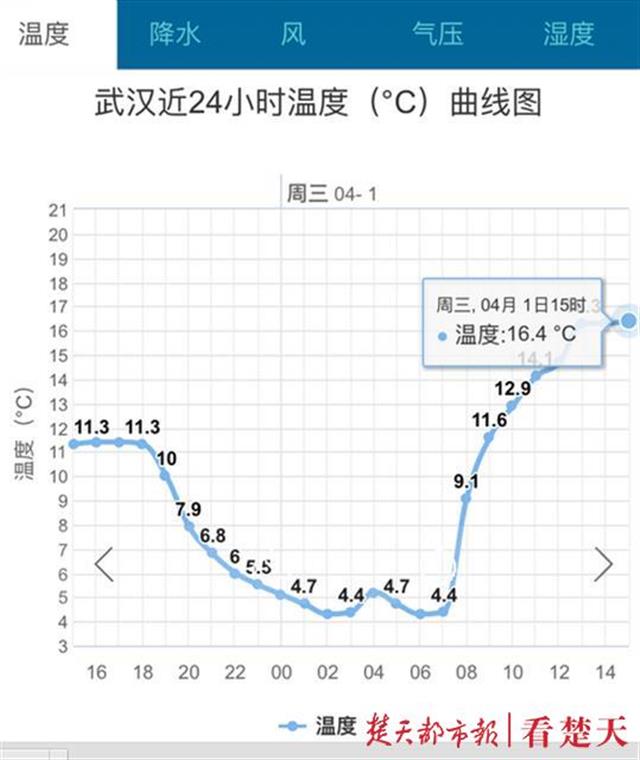 4月1日,除鄂西北在10℃附近以外,湖北省中东部午后高温在15℃-21℃,武汉午后高温在16.4℃。
