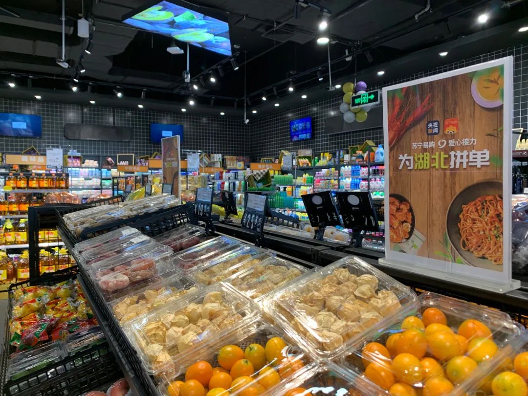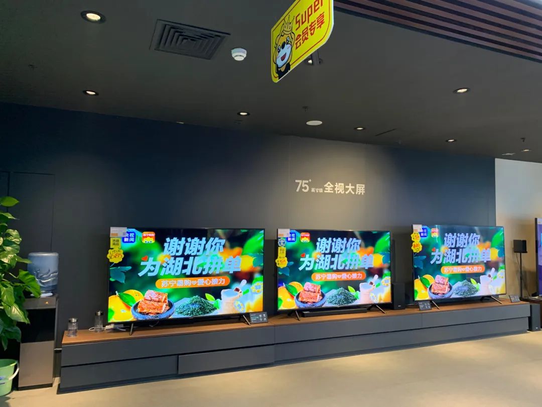 ▲ 苏宁电器各卖场播放“谢谢你为湖北拼单”公益广告