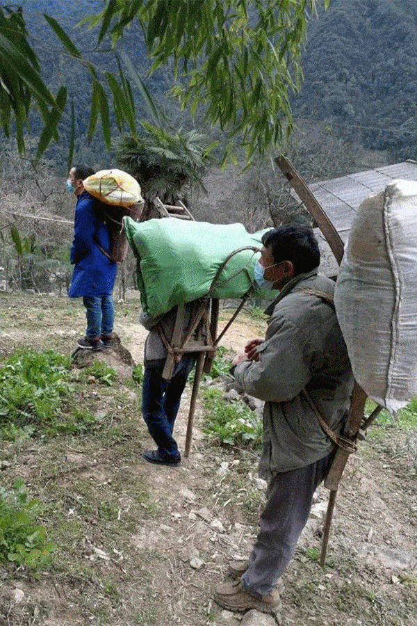 这张照片就记录了村民们肩挑背扛送菜的故事。