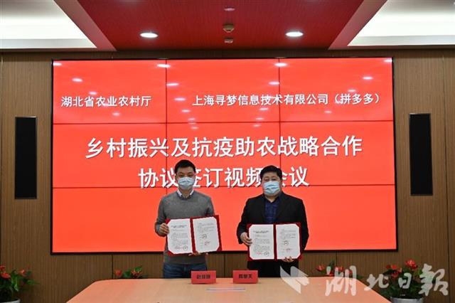 湖北日报讯(记者艾红霞、通讯员李康)为助力湖北农产品迅速流通,方便消费者购买湖北特色农产品。4月1日,湖北省农业农村厅与拼多多合作,共同签署《“乡村振兴及抗疫助农”战略合作协议》。