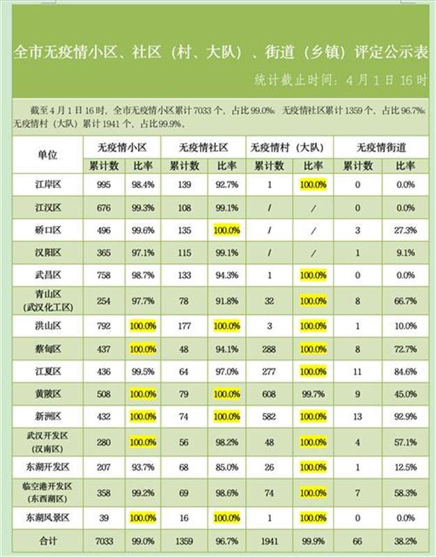 截至4月1日16时,全市无疫情小区累计7033个,占比99.0%;无疫情社区累计1359个,占比96.7%;无疫情村(大队)累计1941个,占比99.9%。