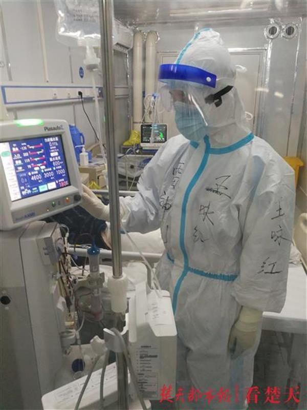 “血透小分队”成员王咏红、王君是武大中南医院肾内科血透室护士,27岁的他们主动承担了多位患者的血透工作。每天早上八点他们都会穿上厚重的防护服,戴好口罩、手套、靴套和护目镜,推着沉重的血透仪器、耗材在病区里穿梭,到患者病房里进行透析,待患者生命体征平稳后,才来到医护通道隔着玻璃观察患者病情变化。下午3点左右完成交班,走出病区时全身衣衫都被汗水湿透。“每天结束工作已经是下午3点,中饭就和晚饭一起吃了。”王咏红表示,刚来时雷神山医院时,一共有30余位需要血透的新冠肺炎患者,每位医护都非常忙碌,自己从3月19日至今只休息了两天。