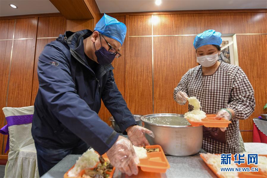 艾厚宇(左)为隔离医护人员准备午饭(3月2日摄)。 新华社记者 张楠 摄