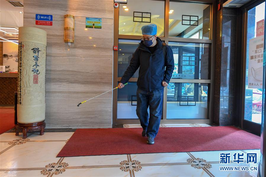 艾厚宇在酒店大堂喷洒消毒水(3月2日摄)。 新华社记者 张楠 摄