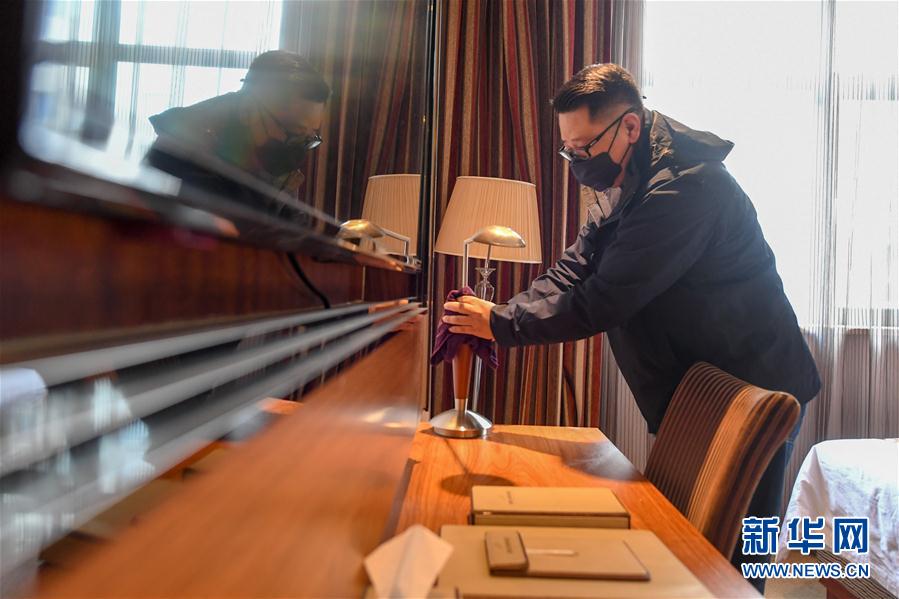艾厚宇更换房间备品(3月2日摄)。新华社记者 张楠 摄