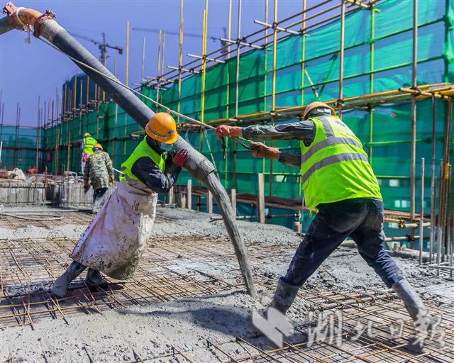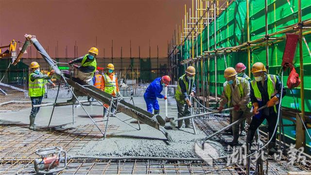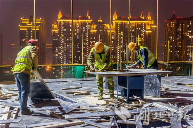 4月2日夜,中国一冶建设者正在武汉普仁医院新建医技综合大楼项目进行围板拼装,加快项目施工进度。施工现场四台混凝土罐车轮流进出,19层作业面聚集着数十名工人振捣混凝土、推泵,此次浇筑总方量达300立方米。该项目是重点民生保障工程,是武汉市首批复工的项目。项目部从3月25日开始,安排“点对点”包车将工人从湖北多个地区,分3次接到工地,目前工人返岗率超95%。(湖北日报全媒记者 梅涛 通讯员 熊思阳 摄)