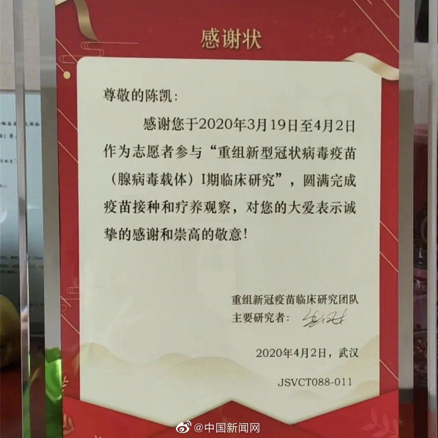 陈凯顺利通过体检筛查,成为低剂量组的志愿者之一,此外还有中剂量组、高剂量组。3月19日,他撸起左袖管,勇敢地接种了新冠疫苗,然后到指定酒店隔离观察14天。