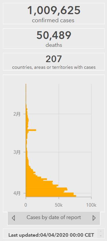 世卫组织实时统计数据显示,截至欧洲中部时间4月4日0时(北京时间4月4日6时),全球新冠肺炎累计确诊1009625例,死亡50489例。目前全球已有207个国家和地区出现新冠肺炎病例,中国以外超过92万例。
