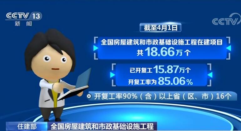 数据显示,截至4月1日,全国房屋建筑和市政基础设施工程在建项目共18.66万个,已开复工15.87万个,开复工率为85.06%,其中,16个省(区、市)的开复工率达到90%(含)以上。此外,全国售楼处复工率达92.73%。