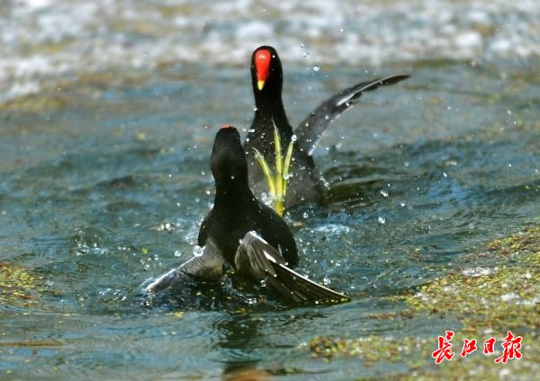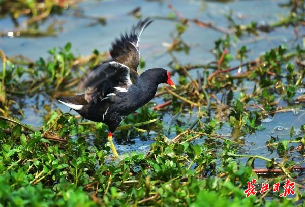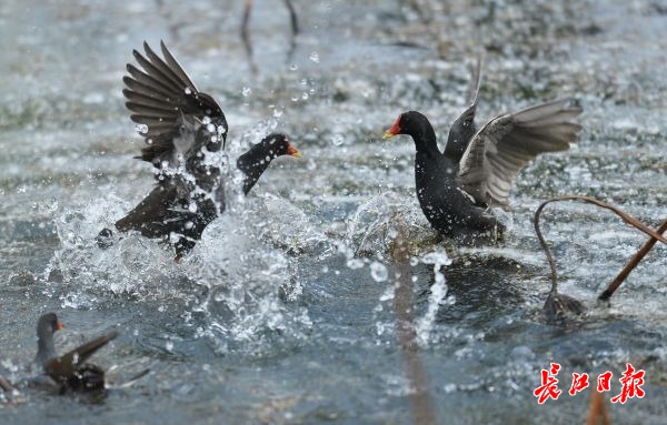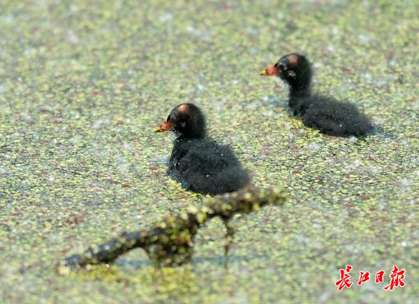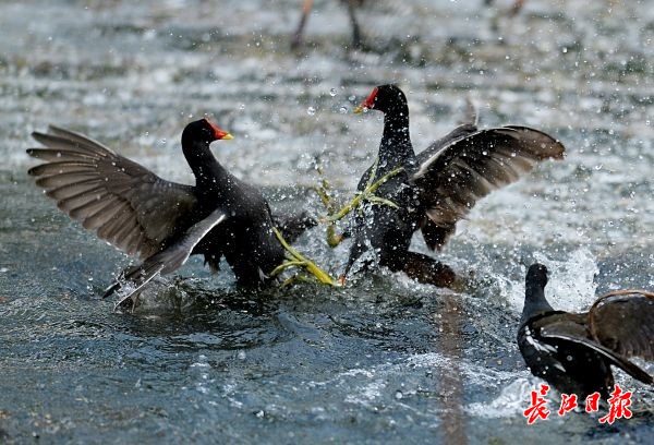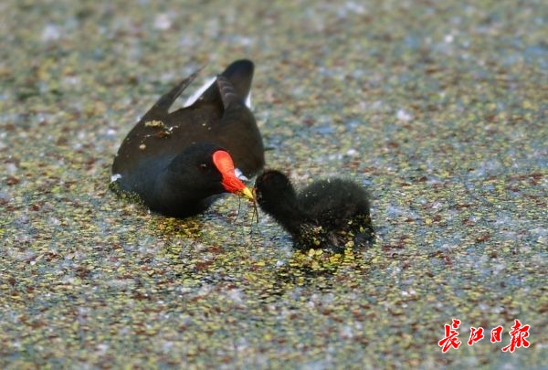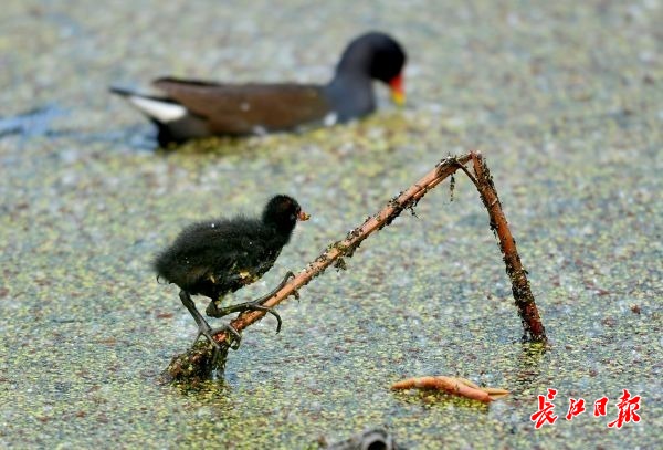 长江网4月5日讯 5日,金银湖湿地公园,几对黑水鸡带着它们的小宝宝在池塘觅食。公园里的池塘热闹起来了。 (记者喻志勇 摄影报道)