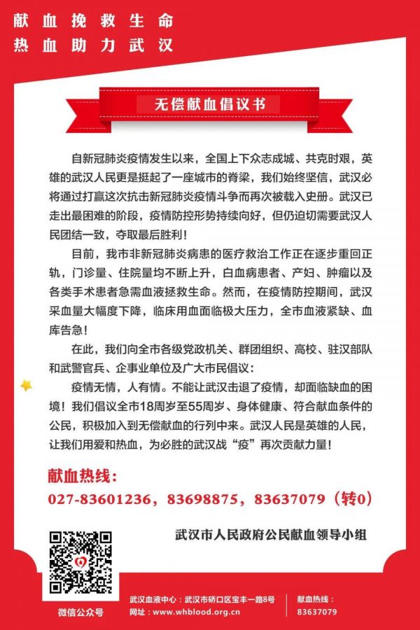 长江网4月5日讯 “武汉人民是英雄的人民,让我们用爱和热血,为必胜的武汉战疫再次贡献力量!”4月5日,武汉市人民政府公民献血领导小组向全市发出倡议:呼吁18-55周岁,身体健康,无基础性疾病,无新冠肺炎感染史或接触史的市民踊跃参与无偿献血,帮助临床患者渡过生命难关。