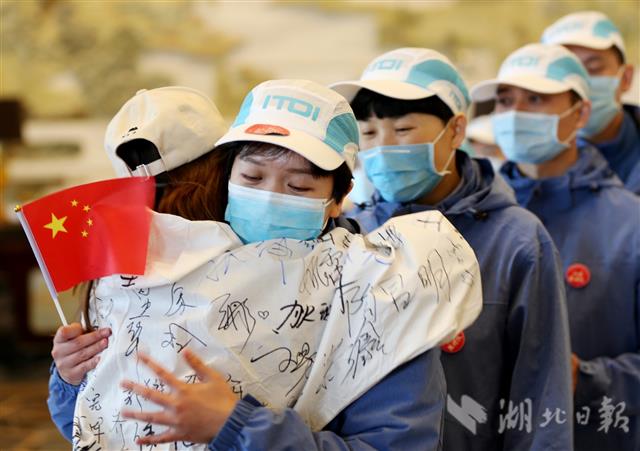 3月30日,山东省第十二批援鄂医疗队圆满完成救治任务返程与志愿者深情拥抱依依惜别。