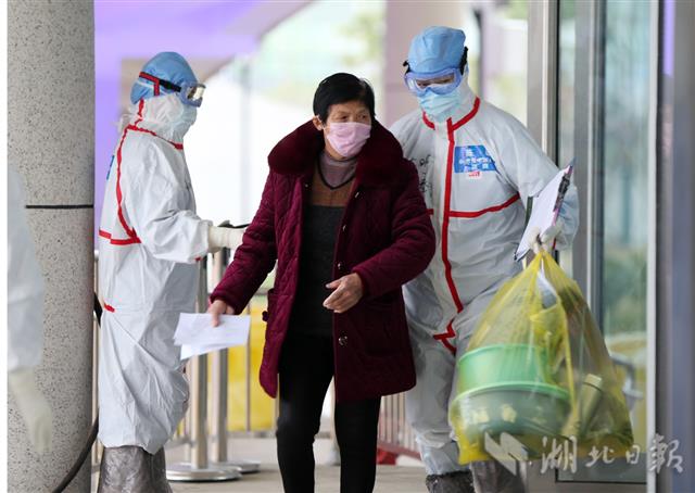 2月14日,湖南省援鄂医疗队员在江夏方舱医院收治首批新冠肺炎轻症患者。